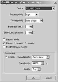 在设置对话框中选择“Device(设备)”为“AX_ASIO Driver”,为避免AC'97声卡所存在的SRC问题,可以设置重采样(Resampling)的采样率(Sample rate)为4.8kHz,其他则可以使用默认值,然后,点击“OK”按钮完成设置。在重新运行Winamp 5后,如果没有意外,就可以听到通过ASIO API发出的声音了。