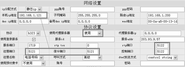 使用IE浏览器,进入话机的设置界面,在“网络设置”中,设置分配给话机的IP地址。在“使用代理服务器”后选择“使用”,并在“注册端口”和“信令端口”栏中填写“本机IP地址的最后一位数+5000”,如图1中的IP地址为192.168.1.121,则填写为5121。在“RTP端口”及“控制端口”填写5122,其中RTP端口必须为偶数。设置完毕,单击“更新”按钮进行保存。