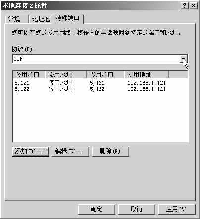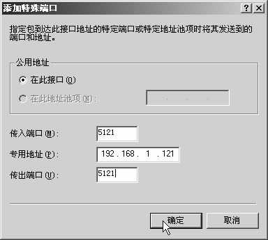 在“传入端口”和“传出端口”栏输入5121,在“专用地址”栏输入192.168.1.121,点击“确定”按钮返回上一界面,单击“添加”按钮,将TCP的5122端口也映射在地址192.168.1.121上(图3)。