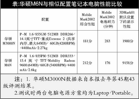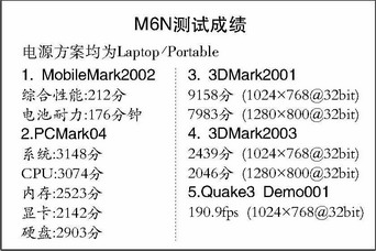 当Pentium-M 1.4GHz处理器的价格降到和Pentium-M 1.3GHz的价格差不多时,Pentium-M 1.4GHz开始成为入门笔记本电脑的标配,而高端笔记本电脑目前更多地采用1.6GHz的处理器。因为M6N采用了独立的显示芯片,所以M6N的芯片组采用的是未集成显示功能的Intel 855PM,支持AGP 4×,855PM的内存性能比855GM强一些,因为855PM可以支持DDR333内存,而855GM最大只支持到DDR266。M6N实际使用的内存为两条256MB nanya DDR333,硬盘为日立Travelstar 8K80系列,5400RPM,60GB,液态轴承马达,运行时的噪音非常小。PCMark04测出的内存和硬盘子系统性能提高不少。从表中我们可以看出,在同样的CPU下,内存和硬盘的增强使M6N的综合性能,相比配置相近的华硕M3000N笔记本电脑提高了17%。