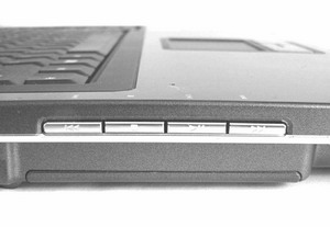 AudioDJ几乎已成华硕笔记本电脑的标志之一,它可以实现在不开机的情况下播放光驱里的CD音乐。M6N的AudioDJ按键位于机身左侧,先拨动AudioDJ电源开关,黄色的指示灯会亮起。4个长条形的银色按键,非常精致,担当着前进、后退、播放等任务,可惜M6N取消了AudioDJ以前带有的两个音量控制键,播放时不能调节音量确实让人沮丧。M6N的另外一个创新就是采用了4声道的喇叭,两个喇叭位于LCD下方,另外两个喇叭位于机身前部左右两侧。不过在笔记本电脑上设置4个喇叭,并不能营造环绕声效果,除了让声音更洪亮,意义实在有限。
