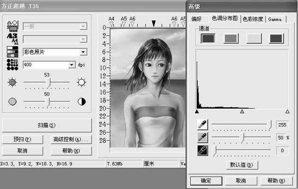 超越T35本身提供有图像扫描软件,也可以借助其他图像软件进行扫描,如Photoshop。超越T35的扫描界面如图3。整个操作比较简单,在左边的设置区就可以解决基本的操作。如果你需要更精细的设置,可以点“高级控制”按键,在“高级控制”里面的“偏好窗口”、“色彩分布图”、“色彩浓度”和“Gamma”四个设置区进行设置。其中“偏好窗口”用来控制图像扫描和预览区的动作,这里有“去网点”、“滤镜”等设置。“色彩分布图”是用来调整图像色彩不清晰的设置。这些设置都比较简单。如果你有一定的印刷和色彩基础知识更好,如扫描的分辨率设置,下面我们再来看看它的扫描效果如何。