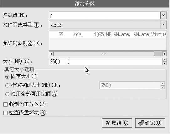 笔者只创建了一个Ext3文件系统分区,当然用户可以根据自己的需要创建多个。在“挂载点”栏中,将这些分区挂载到不同的Linux目录中,如果只创建了一个分区,则必须将该分区挂载到“/(根目录)”中。
