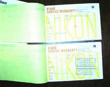 行货数码相机都会提供保修卡,如果你的DC没有保修卡,那肯定不是行货了。此外,商家也可能会用假冒的保修卡来欺骗用户,所以购买前应该咨询厂商保修卡的具体细节。比如图1中有两张报修单,上面是尼康885水货保修卡,下面是尼康885行货的保修卡。我们很容易看出,行货保修卡上面有尼康中国代理公司的中文印章,而水货尼康数码相机则不具备这样的印章。当然,这只是鉴别水货数码相机的方法之一,因为现在很多水货DC经销商自己也能伪造出这样的印章,这样一来用户就更难鉴别了。