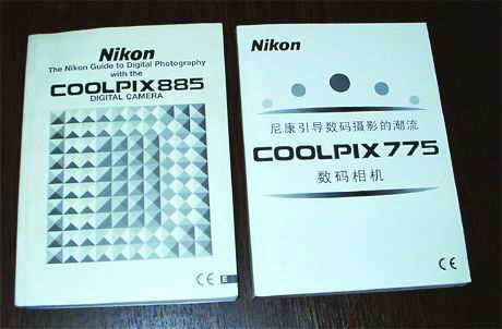 我们再来看看尼康885水货和行货说明书对比图(如图2),图中左边是尼康885水货的产品说明书,右边的图是尼康775的行货说明书,从官方我们获悉,国内销售的行货尼康数码相机说明书是同样厚度印刷精美的中文说明书,而水货尼康885的说明书从头到尾全是英文,没一个汉字。另外,也有一些水货数码相机能够提供中文说明书,但由于采用了翻印的手法,使得说明书文字粗糙简陋,从印刷质量上一眼就能看出区别来。