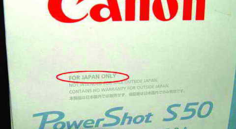 有的水货甚至连说明书和包装都不经过修改直接销售,比如下图3的CANON S50数码相机外包装,包装盒上明明写着“FOR JAPAN ONLY”(日本本地销售),而却在中国市场看到,这样的水货产品你敢买吗?有质量问题得不到任何售后服务。