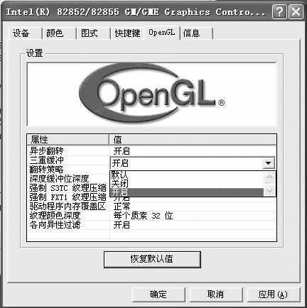 为了发挥显卡的性能,还需要安装适合显示系统的DX8.1或DX9软件,如果你的笔记本电脑已经上网,那么最好采用便捷的在线自动升级安装方式。此外,驱动面板的设置也很重要。进入显卡的图形属性的“OpenGL”设置面板,在下面有很多性能参数选项,如三重缓冲、强制S3TC纹理压缩等,只要用鼠标点击对应的值并设置为打开即可(图1),打开部分功能即可改变图像显示的精度,因为OpenGL中的一些设置针对图形显示进行了专门的优化,可以对3D图形的动画渲染起增强性的作用。