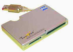 百事灵的USB2.0多功能读卡器(图2)是一款六合一读卡器,它有四个插槽,可读取6种不同的存储介质,包括Compact Flash(CF-Ⅰ/Ⅱ卡)、Smart Media(SM卡)、Multi Media Card(MMC卡)、IBM微型硬盘、Secure Digital Card(SD卡)和SONY记忆棒。该读卡器采用了银色铝合金金属外壳,兼容USB1.1接口,数据传输速度理论上可达480Mbps。此外,这款六合一读卡器附送了一条银色透明的USB延长线。