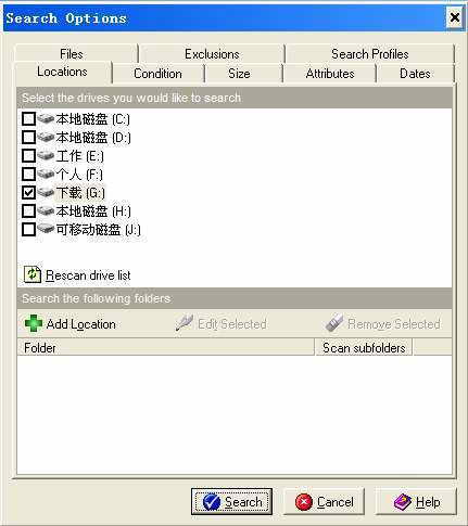 2.高级搜索:进入“Advanced Deleted File Search”界面后点“Search→New search”,在弹出的窗口中提供了众多的搜索条件。你可以根据需要在“Locations”页面中选择想搜索的驱动器(包括数码相机存储卡、MP3播放器、USB闪存等)、添加特定的搜索文件夹;在“Size”、“Attributes”和“Dates”页面中设定想查找文件的大小、属性、日期等条件(图2),然后点击“Search”按钮即可开始搜索文件。