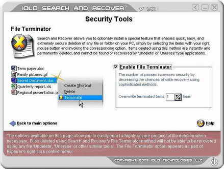 SAR还提供了一个“Security Tools”工具,该工具可通过多次(最多100次)覆盖的方法来彻底删除文件。点击“Security Tools”,在图3中选中“Enable File Terminator”(启动粉碎机)选项,在下面的“Overwrite terminated items”中选择擦写的次数(一般普通用户选择5次就能达到目的)。