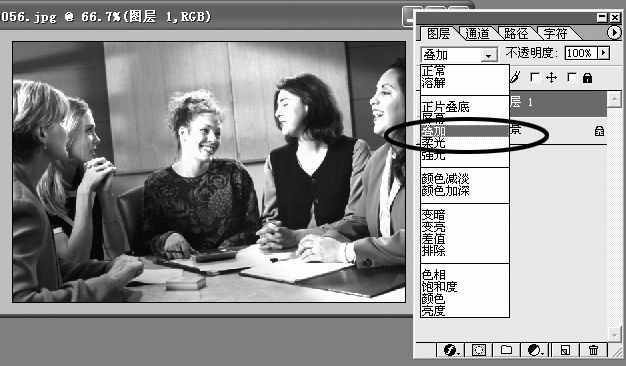 3.在图层面板中的模式效果下拉选项中选择“叠加”模式(图3)。现在你看图片是不是一下子就亮了许多,就像一缕阳光从窗户中照射进来了。