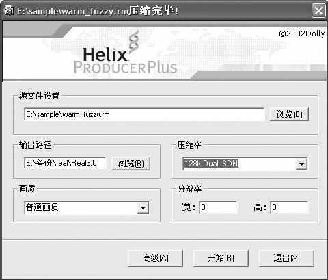 使用Real9压缩器对刚才处理好的片源进行编码。此软件为绿色软件,解压即可使用,启动程序后先选源文件设置,选取准备好的RM文件的文件名,这儿笔者以一个使用RealVideo 8编码的大小为4.87MB的180.9Kbps的MTV文件作为片源来进行压缩。接下来设置输出路径,最后设置压缩率,我这儿设置成128k Dual ISDN,如果要压缩成VBR编码的文件,一定要选名字中带VBR的配置文件,这样压缩出来的电影才是RMVB。分辨率设置如果不想改变就都是0,系统会自动读取片源分辨率(图1)。