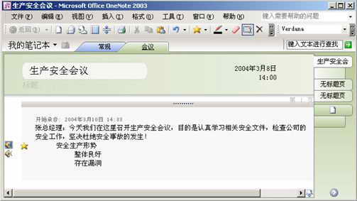 ①打开OneNote 2003,切换到“会议”页面,选中“视图→页标题”,在页面上方的“标题”框内输入本次会议的主题,如“生产安全会议”。