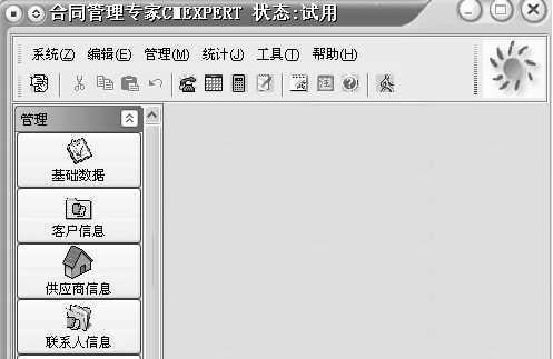 软件的界面比较清爽(见图),采用了目前比较通用的布局方式。软件的主要功能集中在“管理”和“统计”菜单中,包括“基础数据”、“客户信息”、“联系人信息”、“合同信息”、“合同金额统计”、“已结金额统计”等等。这些功能都可以在窗口左侧的任务栏内找到对应的快捷按钮,操作很方便。