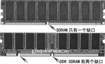 从外形上看DDR内存条与SDRAM相比差别并不大,它们具有同样的长度与同样的引脚距离。只不过DDR内存条有184个引脚,金手指中也只有一个缺口,而SDRAM内存条是168个引脚,并且有两个缺口(图1)。