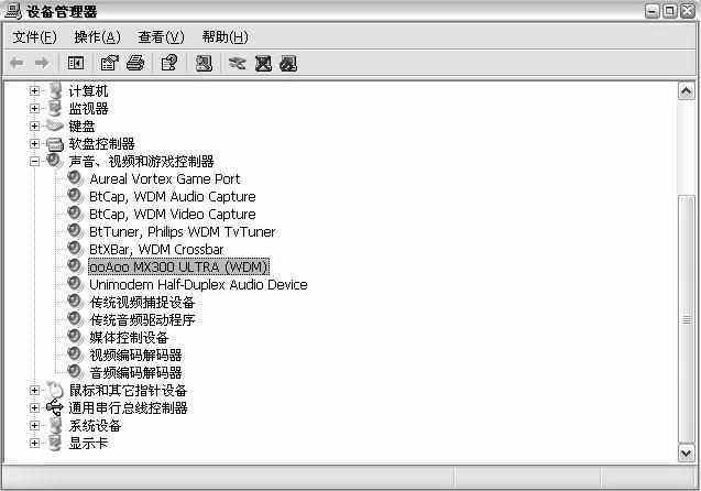 下载了傲王的驱动程序和WinXP下的音效增强工具,开始升级声卡驱动程序(下载地址为http://www.a3d.com.cn/mu/ooaooxp3.rar , 相关网页为http://www.a3d.com.cn/file/pro/pro.htm)。更新声卡驱动程序时指定到驱动程序文件夹,却怎么也搜索不到,换一个方式,直接指定到升级文件就OK了!再看看设备管理器,已经变成了“ooAoo MX300 ULTRA(WDM)”(图1)。