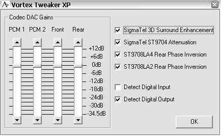 安装完驱动程序重新启动后,效果果然有一点提升!可是费了这么大力气不会就这么点效果吧?于是又打开附带的音效增强工具,试试调节一下看能否继续提升效果?Hardware Equalizer(硬件均衡器)(图2)是调节音效的,根据你听的音乐类型选择相应的模式!还有一个设置选项是Vortex Tweaker XP(多媒体数字编解码器设置)(图3),左边是调节数字编解码器的通道增益的,PCM是脉冲编码增益调节,Fornt是前置通道增益调节,Rear是后置通道增益调节。一般来说左边的滑块不需要调节了,有耐心而且对音效要求比较高的朋友可以调节试试。右边的选项是关于芯片输出方面的,第一个是打开3D音效增益(这个一定要选上),剩下的三个是ST9704和ST9708数字编解码芯片专用的设置选项。我的卡是享受不到了,不过看这几个设置的意思好像是用了ST9708芯片的声卡可以使用4声道。最后两个是数字音频输入和输出的选项。重新启动后双击打开音量控制,多了一个高级选项,可以选择3D音效了。看来刚才的调节起作用了,努力没有白费!