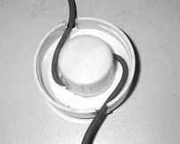 接下来同样把可乐瓶盖沿直径方向开两个缺口,然后把鼠标线卡在其中,用强力胶将瓶盖固定在盒身内。固定时要注意使瓶盖缺口与盒身缺口交叉呈十字形(图2)。