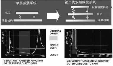 顾名思义,第二代双层减震系统就是在原有的单层减震系统上再加上一层动态平衡系统,采用两层悬吊减震装置来达到降低噪音的目的,整体相当于一个吸震器,能将马达高速转动时所产生的振动能量吸收掉,噪音也相应减小。原理图和实际效果如图1所示。