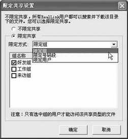 在“共享管理”中的文件共享目录中选中该类别,点击鼠标右键,从菜单中选择“限定共享”,在弹出的“限定共享设置”窗口中点选“限定共享”,再选择一种限定方式(如图)。