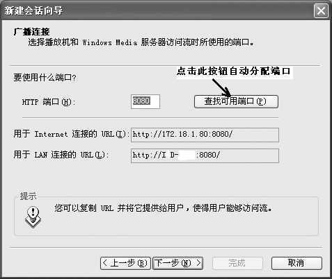 完成安装后,运行Windows Media编码器,将会弹出向导窗口。选择“广播实况事件”,进入“设备选项”对话框。在完成对音频、视频设备的选择后点击“下一步”,在“广播方法”对话框中选择“自编码器拉传递”选项,接下来进行广播连接设置(图1)。在进行HTTP端口设置时,要确保设定值与其他访问端口不会发生冲突,可以点击“查找可用端口”按钮让系统自动分配端口。在接下来的“编码选项”窗口中,设置合适的视频和音频编码方式。由于设置过高会导致接收端的画面出现停顿,因此笔者建议大家选择系统默认的设置即可,最后点击“完成”按钮便完成了基本的设置工作。