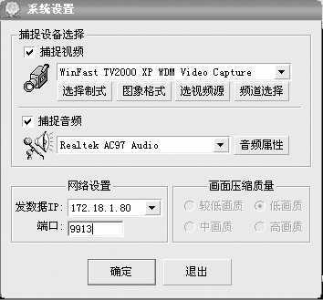 在操作界面上单击鼠标右键,在弹出菜单中选择“系统设置”,在“系统设置”对话框中设定视频和音频的捕捉设备(图2),发送数据的IP地址由软件自动侦测得到,播放的端口设为9913。