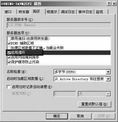 以Windows Server 2003系统为例,在DNS服务器中,依次点击“开始→程序→管理工具→DNS”选项,进入DNS管理器窗口,鼠标右键点击DNS服务器图标,在弹出的快捷菜单中选择“属性”选项,接着在属性对话框中切换到“高级”选项卡(图1),确保“服务器选项”列表框中的“启用循环”选项处于选中状态。