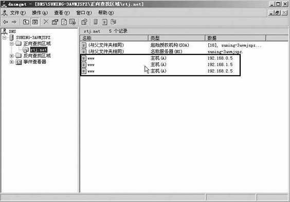 完成了以上三条主机记录的创建后(图2),就实现了Web服务器的网络负载均衡。这样当客户机访问www.rtj.net网站时,就会向DNS服务器发出域名解析请求。DNS服务器收到第一个请求时,会把第一个IP 地址192.168.0.5返回给客户机,当第二个客户机要求域名解析时,DNS服务器就把第二个IP地址192.168.1.5返回给客户机。通过这样的循环分配,就可以把客户机的访问分担到不同的Web服务器上,从而实现网络负载均衡功能。