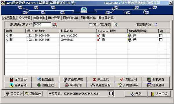 对付不自觉的员工浑水摸鱼、搭车上网,可以在Easy网管软件的“用户表格”中选择用户,按“停止上网”按钮封锁该用户Internet访问,按“恢复上网”进行解锁。整个网络的用户系统会自动扫描并记录其IP地址(图1)。