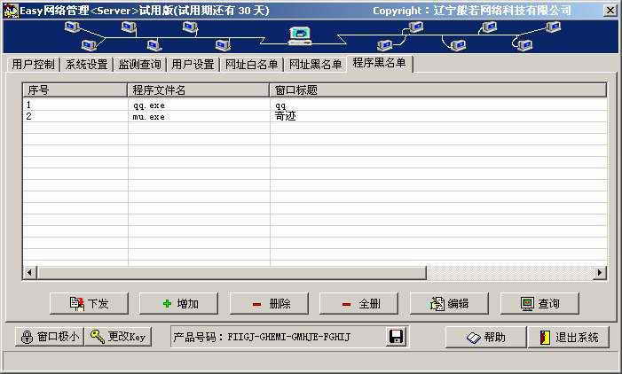 在刚才的界面里,还能为每台计算机规定是否可以使用QQ,在什么时间可以使用QQ。例如我们这里规定QQ在允许上网的时间段内使用,其他时间用户使用QQ将自动终止程序进程。那就该点击“程序黑名单”选项卡,按“增加”按钮,弹出“输入程序黑名单”窗口,在此输入程序文件名、窗口标题和限制时间范围。另外为了防止用户通过修改程序文件名来逃避“程序黑名单限制”,请输入窗口标题。即便是用户修改了文件名也没关系,Easy网管照样可以在内存中查找到这个进程,终止程序进程。被列入“程序黑名单”的程序不能在用户计算机上运行,这样员工上班时间再也不能偷偷摸摸玩网络游戏了(图2)。