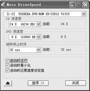 延长笔记本电脑光驱的寿命和降低使用时的噪音,一般可通过专门的软件来达到,不过要占用系统部分资源,如用CD-Quick Cache、DriveSpeed、Windows优化大师等都能对笔记本电脑光驱进行优化。其中CD-Quick Cache可将内存或硬盘的部分空间作为光驱的高速预读缓存(Cache),减少了读盘时停顿等现象,提高了光驱的性能,同时还能避免播放影碟时出现画面断断续续的现象。但这个软件在WinXP下无法使用,建议WinXP的用户使用DriveSpeed工具(下载地址为http://www.onlinedown.net/soft/14804.htm),使用DriveSpeed可以自由设置光驱的速度以降低噪音,同时还可设置光盘的读取旋转停止时间(图1),还具有光驱弹出控制功能。