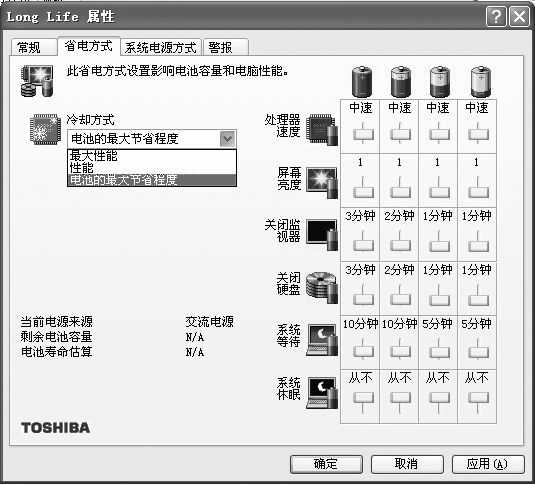 笔记本电脑电池一般只能维持3~4小时,就算采用迅驰技术后也只能维持6个小时左右,这远远达不到我们的要求。其实,只要对电源管理进行一些优化设置,就可以达到省电、延长电池使用时间的目的。可以进入控制面板的电源管理面板进行省电设置,设置技巧很简单,打开后一目了然。但Windows系统自带的电源管理功能还不是很完善,大部分品牌笔记本电脑厂商(如东芝、IMB、HP等)都为自己的笔记本电脑开发了专用的电源管理程序。如笔者的东芝A10笔记本电脑,在安装了东芝的Toshiba ACPI Common Modules电源管理模块后,具有很多高级设置功能。打开控制面板的“东芝省电”图标,就可以在“使用电池“中选择 “Long Life”(长时间)、“Normal”(正常)、“High Power”(高电力)等使用电池的方式。进入“详细信息”后选择“省电方式” 选项,把“冷却方式” 设置为“电池最大节能程度”比较理想(图2),同时这里可以按照电池的电力情况来对“省电方式”进行更精确的调整,如选择处理器的工作模式、调节屏幕的亮度和关闭监视器的空闲时间、调节硬盘关闭的空闲时间(无鼠标或键盘操作的时间),以及设置系统进入“等待”或“休眠”状态所需要的空闲时间等等。