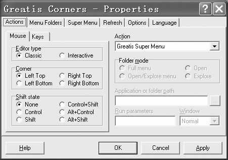 软件的默认设置显然不能满足我们的要求,所以就要我们自己动手来给“角”分配任务。用鼠标左键双击托盘中的图标启动软件的属性(Properties)对话框(图1)。选择“Actions”标签,设置四角的功能和快捷键。这里以设置左上角的功能为例来说明一下它的使用方法。