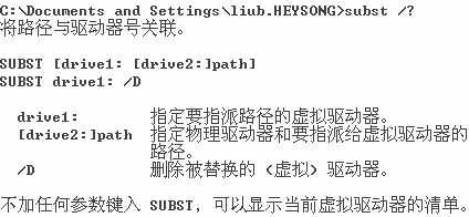 关于subst命令的使用方法,可以通过“subst/?”查看该命令的帮助。需要注意的是,subst不能虚拟已经存在的驱动程序盘符。