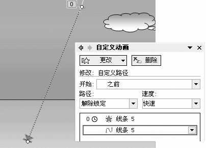 再次选中雨丝,单击“添加效果→动作路径→绘制自定义路径→直线”,然后用鼠标沿着雨丝的方向绘制一根斜直线,调整好长度,在“自定义动画”任务窗格中,将“开始”栏设为“之前”,“速度”栏设为“快速”(图3),并在“效果选项”对话框“效果”选项卡中勾选“平稳开始”和“平稳结束”两个复选框,在“计时”选项卡中将“重复”栏设为“直到幻灯片末尾”。