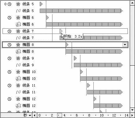 在任务窗格的下方右击鼠标,选择“显示高级日程表”,我们就可以看到幻灯片中每个对象出现的时间安排,把所有线条出现的时间都往后移动一下,使它们出现的时间没有规律。