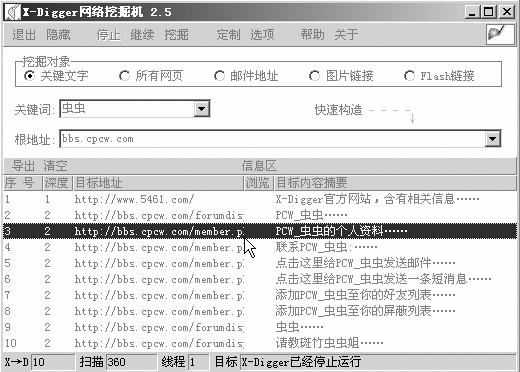 不知你是否有过与笔者相同的经历:在搜索引擎中搜索关键字,得到的结果有些属于废旧的链接。这是因为我们实际上都是从搜索引擎的数据库中进行搜索的。试试网络挖掘机X-Digger(以下简称X-D)吧,它可以针对特定网站进行搜索。它采用多线程工作方式,搜索速度快,并具备自动跟踪目标以及信息保存功能。例如想知道《电脑报》论坛里关于小编虫虫的帖子的信息,跟我来看看具体操作吧。