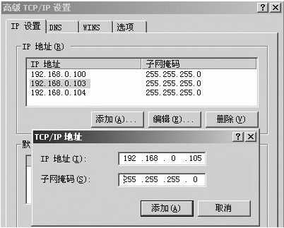 (1)在“网络和拨号连接”属性中分别为各个班级添加IP地址段(见图),192.168.0.103~192.168.0.105(3~5班),子网掩码均为255.255.255.0。