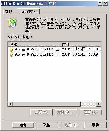 在“属性”窗口中会出现一个“以前的版本”选项卡,进入该选项卡设置界面后,可以发现该窗口中的“文件夹版本”列表中有一个或多个版本可供选择(见图)。