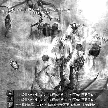 3月18日早晨4:00,记者进入A3成都2-2服务器的血色沙漠。这里是刚刚学会群杀法术的法师练级的天堂,服务器开了这么长时间,在这里练级人应该比较多。进入血色沙漠后只见对话框中满是诸如“挂机练级~抢怪有理”、“挂机!万一抢怪请不要PK,我开了自动反击”、“A3XX(某外挂软件名称)强,挂机打宝好帮手”一类的话语。在城里不时会看见嘴里喊着挂机,却能继续满地跑,甚至与其他玩家抢怪的人──据经验判断,这些人八成属于使用外挂的ID。