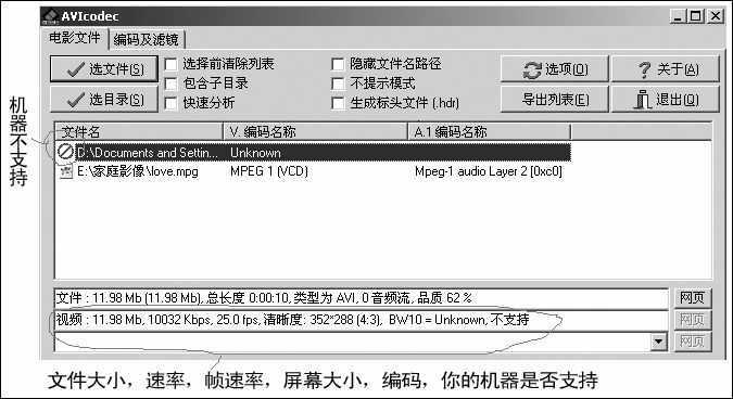 首先打开AVIcodec,选择目录和文件,导入AVI文件,就可以清楚地看见AVI文件的大小、速率、帧速率、屏幕大小、编码方式、机器支持与否(见图)等信息,当你碰到不支持的编码方式时也没有关系,你可以知道它所采用的编码方式是BW10,通过查询右边的网页,下载所需的编码方式,你就可以顺利播放、使用AVI文件了。你还可以通过编码及滤镜这一选项卡,查询你机器上的音视频编码方式。有了AVIcodec就可以走遍天下都不怕了。