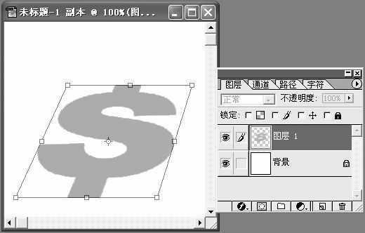 2.画一个任意形状(可以是文字、也可是一个图),然后按键盘上的“Ctrl+T”组合键,将形状调整倾斜一点,如图2所示。满意后点工具箱中的选取工具,最后点“应用”。