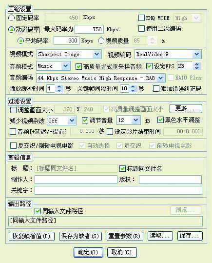 启动ERP,然后点添加来选择要压缩的文件,接下来点参数设置(如图)。压缩设置中可以决定采用老的固定码率的RM还是现在流行的动态码率的RMVB格式。如用动态编码建议大家最大码率不超过750KB,平均码率不要低于300KB。为了获得更好的画面质量,片源质量高时平均码率相应也要提高,但最高也不宜超过550KB。在视频编码这一栏中,ERP提供了Real Video8/9/10这三种编码核心(也就是Real Player8、Real one Player9和Real Player10分别采用的编码核心),这里我建议大家用比较成熟的RealVideo9编码格式。