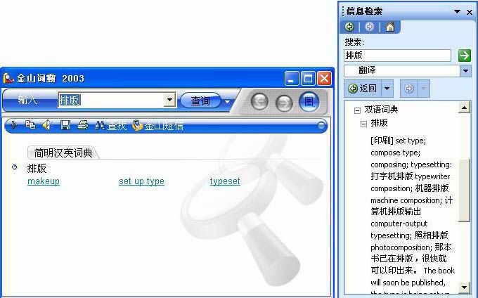 图2为Word 2003和金山词霸对“排版”进行的翻译,由此可见,对于正在编辑的一篇文档,其中某个单词需要翻译,根本不需要打开专业翻译软件,完全可以由Word 2003自带的翻译功能进行翻译,具体应用如下: