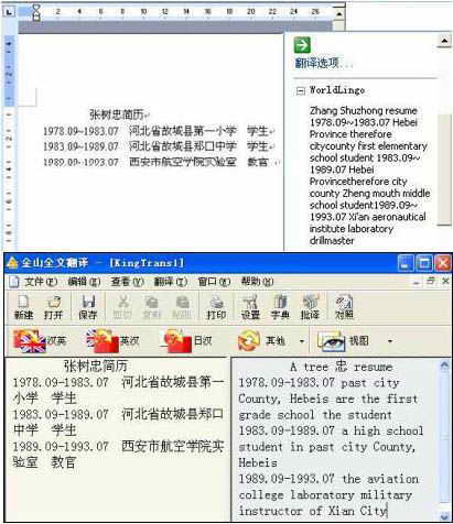 为了验证Word 2003的翻译效果,笔者制作了一个简单的简历,分别用金山快译和Word 2003的在线机器功能进行了翻译,结果如图3所示。从翻译结果中我们可以看出,用Word 2003翻译的结果比金山快译全文高质量翻译的准确度要高得多。例如,Word 2003中把 “张树忠”翻译为“zhang shuzhong”,而金山词霸则翻译成“A tree 忠”,地名“郑口”金山就没能翻译出来。