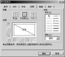 1.制作字符文本框 注意:为了能在斜线区域中方便地调整字符位置,使字符在斜线区域中合理地布局,需要将每一文本框中设定只有一个字符。其原因也很简单,这样能尽可能减小表头空间大小,从而将表头做得更加紧凑。使用“方框”按钮可以方便地在斜线上下方添加文字,但文字周围有边框,要想取消,可选中文字框,调出快捷菜单,选择“对象格式”→“图案”,选择“无边框”即可。