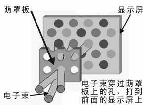 首先,显像管内部的电子枪发射出高速的三束电子束,以极高的速度去轰击荧光粉层。它们分别受显卡R、 G、 B三个基色视频信号电压的控制,经过偏转线圈的作用穿越荫罩的小孔或珊栏,去轰击荧光粉层。受到高速电子束的激发,这些荧光粉分别发出强弱不同的红、绿、蓝三种光,根据空间混色法(将三个基色光同时照射同一表面相邻很近的三个点上进行混色的方法)产生丰富的色彩,这种方法利用人们眼睛在超过一定距离后分辨力不高的特性,产生与直接混色法相同的效果。用这种方法可以产生不同色彩的像素,而大量不同色彩的像素可以组成一帧漂亮的画面,而不断变换的画面就成为活动的图像。