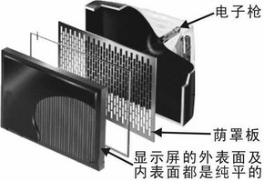 普通的显像管采用点状式荫罩技术,而SONY(索尼)开发的“FD Trinitron”(特丽珑)显像管采用了先进的单枪三束电子枪和荫栅(Aperture Grille)技术(图3)。