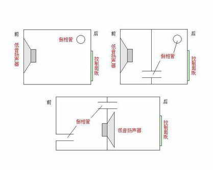 一般说来,低音炮内会有两个腔体,低音扬声器被安置在其中一个腔体内,低音扬声器工作时对内部的空气产生作用,使得扬声器的低频下限得到升高。然后经过内部的一根倒相管将声音倒相后送入另一个腔体,随后与外界相通的倒相管再将内部的声音倒相后送到箱体外。我们在市场上可以常见的三种低音炮的内部结构如图所示。