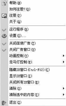 该软件的安装过程非常简单,只要一路点击Next按钮即可完成(安装前务必关闭所有浏览器窗口)。运行程序后,它会以盾牌图标自动缩至系统托盘中。右击盾牌图标,在弹出的菜单中,软件已经自动将“关闭广告窗口”作为勾选状态,如图所示。点击选取“设置”命令,在窗口中可以对该软件进行功能设置。另外该软件除了在屏蔽广告窗口方面身手不凡外,还有很多辅助功能,例如关闭信使服务、隐藏IE窗口、清除上网记录等,该软件极易上手,笔者就不再啰嗦了。